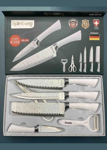 Всі предмети виготовлені із якісної нержавіючої сталі. Рукоятки ножів зроблені з нержавіючої сталі та бакеліту.