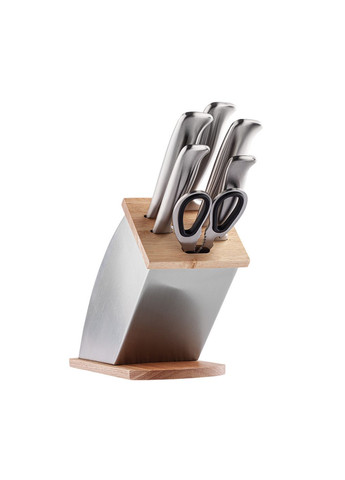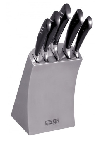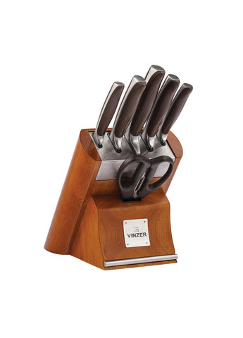 Набір кухонних ножів Vinzer Iceberg 7 предметів (50110) Склад набору: Ніж кухарський: довжина клинка 20.3 см, товщина 2.5 мм Ніж для м'яса: довжина клинка 20.3 см, товщина 2.5 мм Ніж для хліба: довжина клинка 20.3 см, товщина 3 мм Ніж універсальний: довжина клинка 12.7 см, товщина 2 мм Ніж для овочів: довжина клинка 8.9 см, товщина 2 мм Ножиці кухонні: товщина лез 2 мм Підставка для ножів Характеристики: Матеріал леза: високовуглецева сталь 1.4028/X30Cr13, клиноподібний переріз леза Матеріал руків'я: високовуглецева сталь 1.4028 / X30Cr13 Матеріал підставки: дерево, нержавіюча сталь Набір кухонних ножів — ідеальний помічник під час приготування. Ножі різного розміру та кухонні ножиці допоможуть швидко й акуратно нарізати різні продукти. Ножі виготовлені з високовуглецевої сталі, стійкої до корозії та деформації. Клиноподібний переріз леза довго залишається гострим і не вимагає частого заточування. Ручка має ергономічний дизайн, не ковзає під час роботи. Стильна колода виготовлена з нержавіючої сталі та дерева, вміщує всі ножі та стане прикрасою будь-якого інтер'єру. Чудовий набір ножів VINZER Iceberg у стильній підставці, гармонійно доповнить кухонний інтер'єр і стане незамінним помічником у щоденному використанні. Леза ножів виготовлені з якісної високовуглецевої сталі 1.4028/X30Cr13, мають клиноподібний переріз леза, завдяки чому надовго зберігають гостроту і слугуватимуть вам тривалий час. Набір кухонних ножів Vinzer Iceberg 7 предметів (50110) — це ідеальне поєднання довговічності та сучасного стилю. Леза та ручки з високовуглецевої сталі X30Cr13 забезпечують виняткову міцність і гостроту, яка залишається незмінною навіть за інтенсивного використання. До набору входять усі необхідні ножі та кухонні ножиці, а стильна підставка з дерева та нержавіючої сталі стане прикрасою будь-якої кухні. Цей набір створений для тих, хто цінує якість і елегантність у кожній деталі!