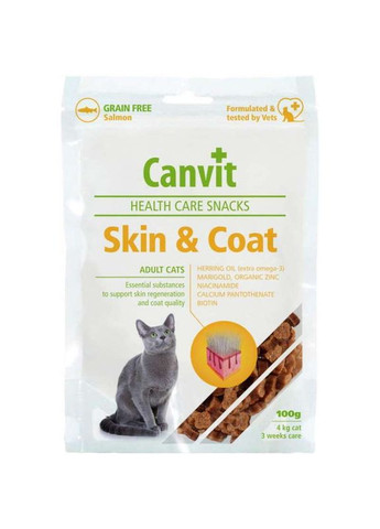Шкіра та вовна – це перша лінія захисту організму від впливу негативних факторів зовнішнього середовища. Для того, щоб шкіра повноцінно виконувала свою функцію, для її метаболізму необхідні вітаміни, мікроелементи та амінокислоти, такі як вітаміни В2, В3, В5, цинк і метіонін, а також омега-3 ненасичені кислоти, що мають протизапальні властивості. Для краси, здоров'я та блиску вовни, особливо для котів шоу класу. Ласощі забезпечують здорове зріст вовни в період линяння, сприяють формуванню здорового кератинового шару кігтів. Можна застосовувати як допоміжну терапію при лікуваннях захворювань шкіри, вовни та кігтів. Гарантований аналіз: протеїн 17%, жир 7%, вологість 17%, зола 5%, клітковина 2.2%. Склад: картопля, лосось (15%), рідкий крохмаль, жир із оселедця (6%), гідролізована куряча печінка, колаген, висушена календула (5 г/кг). Харчові добавки (1 кг): цинк (E6) 120 мг, таурин 1500 мг, вітамін В3 30 мг, пантотенат кальцію 4 мг, біотин 1.2 мг. Інструкція із застосування: ласощі дають прямо з руки або додають у корм.