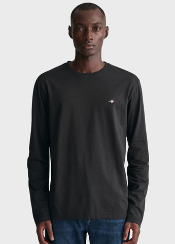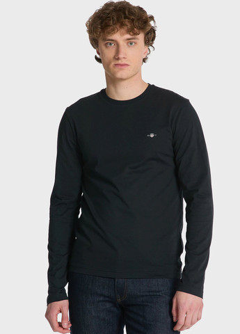 Лонгслів для чоловіків відомого бренду GANT темно-синього кольору, рукав довгий вшитий, виріз горловини круглий, спереду принт із назвою бренда, довжина по спині виробу на розмір XL - 72 cм, довжина рукава на розмір XL - 68 см, напівобхват грудей 55 см.