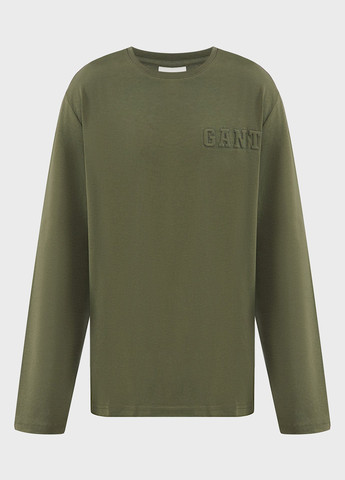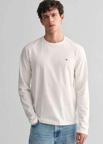 Лонгслів для чоловіків відомого бренду GANT сірого кольору, рукав довгий вшитий, виріз горловини круглий, спереду принт із назвою бренда, довжина по спині виробу на розмір М - 69 cм, довжина рукава на розмір М - 66 см, напівобхват грудей 53 см.