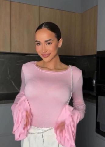Жіночий лонгслів з круглим вирізом горловини, довгі рукави з воланами. Довжина виробу на розмір 42-46: 58 см, довжина рукава: 70 см, обхват грудей: 80-84 см, обхват талії: 56-60 см.