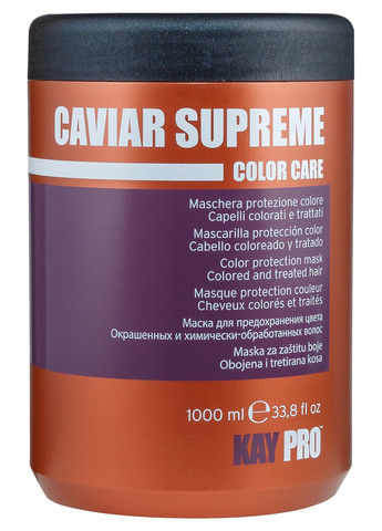 KayPro Caviar Supreme Color Care Protection Mask – професійна маска для захисту кольору та глибокого живлення фарбованого та пошкодженого волосся. Інноваційна формула з екстрактом чорної ікри підтримує інтенсивність кольору, зміцнює волосся та зберігає його блиск. Основні переваги: Розплутує, живить і ущільнює волосся без обтяження. Захищає колір від вимивання та тьмяності. Відновлює пошкоджену структуру волосся. Надає волоссю м'якість, еластичність і дзеркальний блиск. Запобігає сухості та ламкості волосся. Активні компоненти: Екстракт чорної ікри – джерело амінокислот та антиоксидантів, що захищає колір і зміцнює волосяний стрижень. Кератиновий комплекс – відновлює пошкоджену кутикулу, роблячи волосся міцнішим і гладкішим. Вітамінний комплекс – зволожує волосся, захищає від агресивного впливу зовнішніх факторів. Аромат: Витончена композиція з елегантними східними нотами. Для кого цей продукт: Рекомендований для фарбованого, знебарвленого та пошкодженого волосся, що потребує інтенсивного догляду. Результат: Збережений насичений колір, глибоке живлення, шовковиста текстура волосся без обтяження.