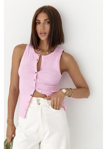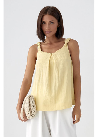 Він має прямий низ і класичну круглу горловину, що надає акуратності та універсальності. Особливістю є підкладка з основної тканини на передній та задній частині, завдяки якій топ не просвічується, забезпечуючи комфорт та впевненість під час носіння._x000D_