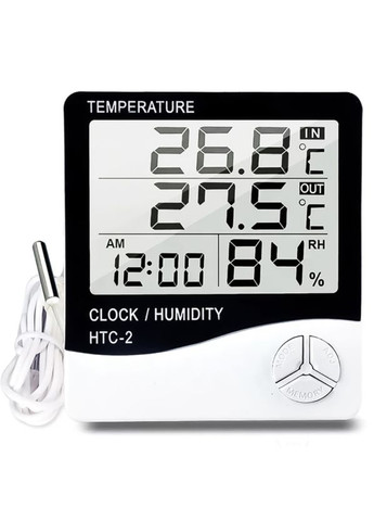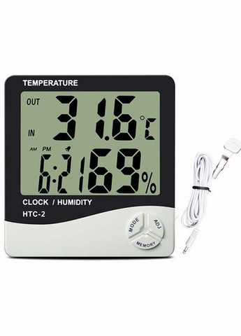 HTC-2 це багатофункціональний прилад - гігрометр, термометр з вбудованим годинником. Пристрій як HTC-2 просто необхідний у кожному будинку, адже він універсальний і крім значень температур і вологості є можливість встановлення будильника. Такий датчик одночасно показує вимірювання температури та вологості, а також запам'ятовує їх максимальне та мінімальне значення. Гігрометр термометр з вбудованим годинником HTC-2 має виносний датчик температури довжиною 1,5 метра, що дозволяє йому показувати вологість та температуру на вулиці. особливості: Цифри, що легко читаються, на великому 2-рівневому LCD дисплеї. Виносний датчик вимірювання температури (довжина 1,5 метри). Можливість вимірювання температури всередині та зовні приміщення. Індикація значення відносної вологості/ Запам'ятовування та відтворення максимального та мінімального значення температури та вологості. Одночасне відображення значення температури, вологості та поточного часу. Вбудований годинник і будильник. Перемикання °C та °F. Можливе кріплення на стіну або встановлення приладу на горизонтальній поверхні.