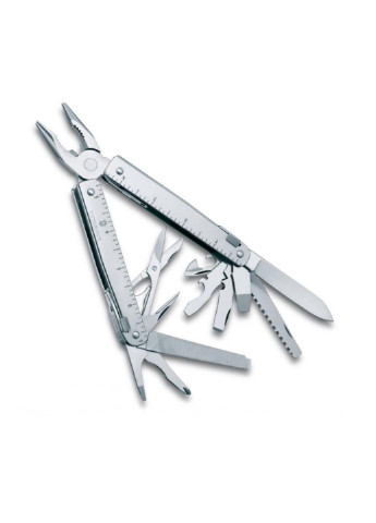 SwissTool на перший погляд – це пасатижі з ручками-лінійками. Але ручки – це піхви для великої кількості інструментів: великого леза, відкривалок, пилки по дереву, напилки, ножівки по металу, викруток та багато іншого. Відполіровані ручки цього мультитул без будь-яких виступаючих частин зручно і приємно тримати в руках. SwissTool ідеально продуманий, сконструйований та виготовлений – швейцарська якість неперевершено! Це відмінний помічник на кожен день, а різноманітність моделей дозволить підібрати потрібний набір інструментів для кожного. У комплект із ножем також входить фірмовий чохол Victorinox. Матеріал: високоякісна нержавіюча сталь Колір: металік Рукоятка: метал Довжина в складеному вигляді: 115 мм Вага: 484 г. Набір функцій - 38 : плоскогубці викрутка 2 мм викрутка 3 мм кусачки для тонкого та м'якого дроту до 40Hrc відкривка для пляшок відвертка 7,5 мм лезо ножиці напилок по металу ножівка по металу пила по дереву шило, кернер хрестова викрутка 1+2 стамеска, скребок потужна фомка інструмент для згинання дроту інструмент для зняття ізоляції скребок ізоляції консервний ніж лінійка (230 мм) електричні щипці інструмент для перекушування твердого дроту отвір для шнурка індивідуальні пружини фіксуючий хутроанізм тримач для насадок ключ з гніздом для насадок: насадка: шестигранник 3 насадка: шестигранник 4 насадка: хрестова викрутка 0 насадка: хрестова викрутка 0 15 місця для додаткових насадок міні-викрутка штопор