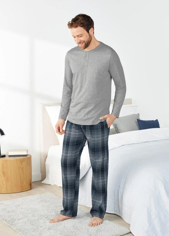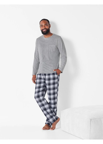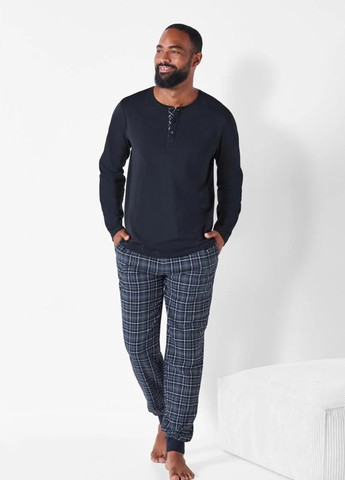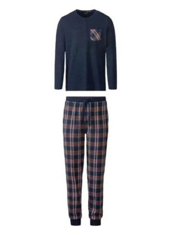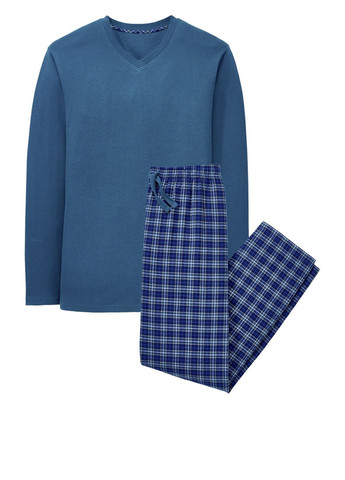 Синій комплект з довгими рукавами в клітинку із надм’якої фланелі.Верх має одну нагрудну кишеню та застібається на міцні сині гудзики. Низ піжами забезпечує ідеальну посадку з регульованим шнурком