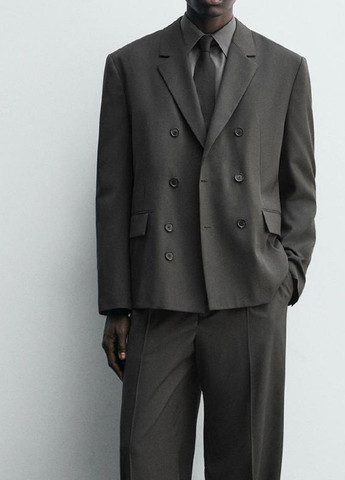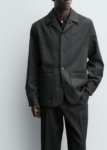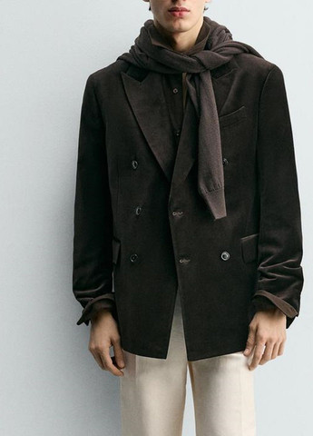 Піджак стандартного крою з тканини з додаванням вовни та 5% шовку. З коміром-лацканом та довгими рукавами з манжетами на ґудзиках, нагрудною прорізною кишенею, кишенями з клапаном на стегнах, внутрішньою кишенею, шліцами ззаду та застібкою на ґудзики спереду.