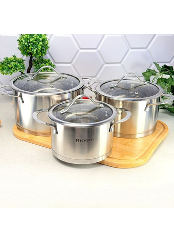 Набір посуду Hagen Об'єм: 1.15, 1.9, 2.6, 3.6, 4.35, 6.1 л Діаметр: 14, 16, 20, 22, 24 см Матеріал: нержавіюча сталь Наявність кришки: так Зовнішній вигляд пакування може відрізнятися від фото Набір посуду RINGEL Hagen найбільший набір для кухні в асортименті. У нього входить ківш 1,15 л, каструлі 1,9 л, 2,6 л, 3,6 л, 4,35 л і 6,1л. Любите готувати різноманітну їжу для своїх близьких, цей набір максимально допоможе вам у приготуванні одночасно всього меню. НЕРЖАВІЮЧА СТАЛЬ, ЩО ЗАБЕЗПЕЧУЄ МІЦНІСТЬ І ДОВГОВІЧНІСТЬ КОНСТРУКЦІЇ Ківш і каструлі з набору Hagen від Ringel виготовлені з нержавіючої сталі з високим вмістом хрому та нікелю, завдяки чому виріб отримує гарантований захист від корозії і деформації, а також не боїться нагріву до високих температур. Разом з тим, нержавіюча сталь, з якої виготовлений набір Leipzig є повністю безпечною для здоров'я. ДЗЕРКАЛЬНИЙ БЛИСК ВІДПОЛІРОВАНОЇ ПОВЕРХНІ Полірована поверхня - запорука прекрасного зовнішнього вигляду та додаткового захисту від корозії. Високоякісна нержавіюча сталь, застосована при виробництві даного набору, за допомогою спеціальних методів полірування отримує цілий ряд покращених характеристик, серед яких простота в догляді, а також тривалий термін експлуатації без втрати зовнішньої привабливості. ТРИШАРОВЕ КАПСУЛЬНЕ ДНО У конструкції ковша та каструлі з набору Hagen застосована спеціальна товста алюмінієва пластина, герметично запаяна всередині капсуля з нержавіючої сталі. Таке рішення дозволяє швидше нагріватися і краще розподіляє тепло по всій поверхні, адже алюміній має підвищену порівняно зі сталлю теплопровідністю. Завдяки цьому приготування їжі займає менше часу, що дозволяє заощадити як енергію і час. НАДІЙНЕ КЛЕПОЧНЕ КРІПЛЕННЯ РУЧОК Ручки, виконані з нержавіючої сталі, мають порожнисту конструкцію, завдяки чому не нагріватися. До корпусу посуду ручки прикріплені за допомогою надійного клепочного кріплення. ВДАЛІ КОНСТРУКТИВНІ РІШЕННЯ НА ВАРТІ ЕРГОНОМІКИ Мірна шкала на внутрішній стороні стінок каструль і ковша допомагає точніше дотримуватися пропорції сухих у рідких інгредієнтів. Прозора кришка з термостійкого скла оснащена клапаном для виходу пари, що дозволяє стежити за приготуванням їжі та випускати зайву пару, не знімаючи кришку. З набором Hagen від Ringel ви зможете приготувати одночасно 5 улюблених страви. RINGEL - бренд якісного посуду та аксесуарів для кухні RINGEL поєднав кращий досвід, сучасні технології та актуальні тенденції у сфері виготовлення металевого посуду. Саме тому ми сміливо заявляємо, що наші вироби дарують споживачу найкраще поєднання ціни та якості за умови, що якість завжди була, є і буде на першому місці. Асортимент продукції бренду RINGEL повністю задовольняє потреби в посуді та приборах найвимогливішої господині. До того ж, зовнішній вигляд усього посуду ТМ RINGEL витриманий в універсальній концепції стриманого та лаконічного дизайну, дозволяє самостійно комбінувати поєднання посуду на кожній окремій кухні. RINGEL - залізний характер, блискучий смак!