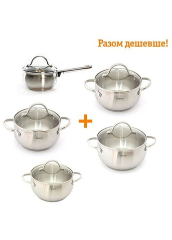 Набір каструль Fissman CHARLOTTE 6 предметів, що складається з 3 каструль з кришками (2 л, 2,5 л та 4,7 л). Виготовлені з нержавіючої сталі та підходять для індукції. Каструля Fissman CHARLOTTE 18 x 9 см 2 л із скляною кришкою 5500 Матеріал: нержавіюча сталь Марка сталі: 18/10 (INOX 304) Колір: салатовий Вес, нетто (кг): 1.38 Повний об'єм, л: 2.0 Кришка в комплекті: так Матеріал кришки: скло, нержавіюча сталь, силікон Матеріал ручки: нержавіюча сталь, силікон Довжина ручки, см: 5 Діаметр, см: 18 Висота стінок, см: 9 Діаметр дна, см: 14.5 Тип дна: індукційне Можна використати в мікрохвильовій печі: немає Можна використати в духовці: немає Можна мити в посудомийній машині: так Тип плити: Gas, electric, glass ceramic, induction Бренд: Fissman (Китай) Каструля Fissman CHARLOTTE 20 x 10 см 2,5 л із скляною кришкою 5501 Матеріал: нержавіюча сталь Марка сталі: 18/10 (INOX 304) Колір: салатовий Вес, нетто (кг): 1.6 Повний об'єм, л: 2.5 Кришка в комплекті: так Матеріал кришки: скло, нержавіюча сталь, силікон Матеріал ручки: нержавіюча сталь, силікон Довжина ручки, см: 5 Діаметр, см: 20 Висота стінок, см: 10 Діаметр дна, см: 15 Тип дна: індукційне Можна використати в мікрохвильовій печі: немає Можна використати в духовці: немає Можна мити в посудомийній машині: так Тип плити: Gas, electric, glass ceramic, induction Бренд: Fissman (Китай) Каструля Fissman CHARLOTTE 4,7 л із скляною кришкою 5502 Матеріал: нержавіюча сталь Марка сталі: 18/10 (INOX 304) Колір: салатовий Вес, нетто (кг): 2.19 Повний об'єм, л: 4.7 Кришка в комплекті: так Матеріал кришки: скло, нержавіюча сталь, силікон Матеріал ручки: нержавіюча сталь, силікон Довжина ручки, см: 5,5 Діаметр, см: 24 Висота стінок, см: 12,5 Діаметр дна, см: 19 Тип дна: індукційне Можна використати в мікрохвильовій печі: немає Можна використати в духовці: немає Можна мити в посудомийній машині: так Тип плити: Gas, electric, glass ceramic, induction Бренд: Fissman (Китай)