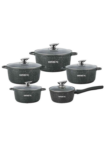 Характеристики Бренд : EMPIRE Модель: Блек Набір: 5 шт Матеріал: Харчовий алюміній Тип покриття : Антипригарний природний камінь Тип дна: Багатошарове Матеріал кришки: Скло Об’єм : 1 / 1 / 1,5 / 2 / 4 л Висота : 7,5 / 7,5 / 8 / 9 / 11 см Діаметр верхній : 16 / 16 / 18 / 20 / 24 см Діаметр нижній : 13 / 13 / 15 / 17 / 20,5 см Форма: Кругла Колір: Чорний граніт Тип плит: Все Посудомийна машина: Так Зберігання у холодильнику : Так Упаковка: Фірмова коробка Країна виробник: К.Н.Р. Опис: Каструля виготовлена з литого алюмінію, це високоякісний, екологічно чистий матеріал, що має високу теплопровідність, гігієнічність і невелику вагу. Тришарове гранітне антипригарне покриття, що не містить шкідливих PFOA речовин, має високу стійкість до стирання, подряпин та інших механічних пошкоджень. Завдяки своєму складу таке покриття легко мити.