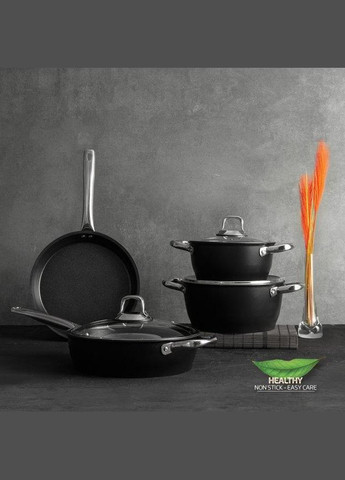 Універсальний набір посуду каструль преміум-класу Casa Royal Diamond Pro Pearl P-UKR2010 з покриттям Greblon Diamond Pro Чорний Сasa Royal – кухонна продукція високої якості, преміум класу. Виготовляється провідною турецькою компанією Pan Kitchen, яка займає лідерські позиції на міжнародному ринку. До переваг посуду торгової марки Casa Royal належать її висока якість, дизайнерські рішення та технічні інноваційні розробки. У посуді Casa Royal можна готувати не лише смачні, а й корисні страви, зберігаючи природний аромат продуктів. Чудова якість від Сasa Royal припаде до смаку як вимогливим кухарям так і домогосподаркам. Набір Pearl Luxury від торгової марки Casa Royal - це ексклюзивний набір в подарунковій упаковці. Складається з 2-х каструль із кришками, сотейник із кришкою, сковорідка. Внутрішнє багатошарове антипригарне покриття Greblon Diamond Pro (C3+) дає міцність діаманта та блиск. Сталевий індукційний диск на 5 мм дні посуду значно прискорює та сприяє рівномірному розподілу тепла по всій поверхні та посилює стійкість дна до деформації. Зовнішнє спеціальне антипригарне покриття, легке у догляді. Зручні ручки, що не нагріваються, зроблені з нержавіючої сталі для безпечного використання. Для всіх типів плит. Заклепувальне з'єднання забезпечує тривалий термін експлуатації ручок. Кришка із термостійкого скла з отвором для випуску пари. Набір посуду Pearl Luxury – не просто якісний та ексклюзивний помічник, а Перлина на вашій кухні. Готуйте з любов'ю з Casa Royal. Особливості: Багатошарове антипригарне покриття Bio Granit Підходить для всіх видів плит Легко чиститься в ручну та відмивається в посудомийній машині. Стильний дизайн із зовнішнім гранітним покриттям та вишуканими ручками Рівномірний розподіл тепла завдяки тонким стінкам Характеристики: Матеріал: алюміній, жароміцне скло; Антипригарне покриття – Bio Granit; Товщина стінок посуду – 4 мм; Потовщене дно; Для всіх типів плит, крім індукційних Фірмова подарункова упаковка; Країна виробник: Туреччина. Комплектація: Каструля із кришкою Ø 24 см, висота 11,5 cm – 4,5 л; Каструля із кришкою Ø 20 см, висота 10 cm – 2,6 л; Сотейник із кришкою Ø 26 см, висота 7 cm; Сковорода Ø 24 см висота 4,7 cm.