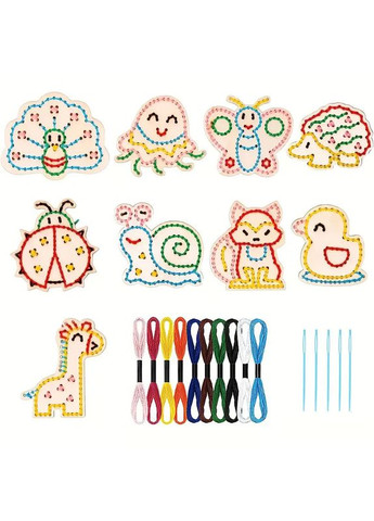 Набір для вишивання з дерев'яними фігурками тварин і комахЦей захопливий набір призначений для розвитку творчих навичок у дітей і дорослих. До комплекту входять дерев'яні заготовки у формі тварин і комах із готовими отворами для вишивання, різнобарвні нитки та безпечні пластикові голки.Завдяки простоті використання набір ідеально підійде для перших кроків у рукоділля. Він допомагає розвивати моторику, увагу, терпіння і почуття кольору.Комплектація 9 дерев'яних фігурок (тварини та комахи) 10 кольорових ниток 5 безпечних пластикових голок Переваги: Безпечні матеріали (дерево та пластик) Підходить для дітей і дорослих Чудовий спосіб провести час усій сім'ї Розвиває уяву та навички рукоділля Такий набір стане чудовим подарунком для дитини або оригінальним варіантом для творчого дозвілля.