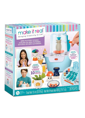 Набір для творчості Make it Real Міні гончарна майстерня дозволить за 10 проектів стати майстром гончарної справи. Дитина може самостійно виготовити глиняний декор, розфарбувати його та прикрасити їм свій простір. Основні переваги: дитина може самостійно виготовити глечик або інший глиняний декор розфарбувати на свій смак і прикрасити їм свій простір процес гончарства вчить дитину бути сконцентрованою та обережною розкриває творчі здібності Характеристики Комплектація: 1 механічний блок 1 підставка для зберігання 1 купол 4 інструменти для центрування Знімне колесо, що обертається Пластиковий лист 1 двосторонній інструмент для різьблення 4 наконечники для інструментів Вісь (веретено) 3 напрямні для шаблонів 1 упаковка білої глини 1 губка 3 кольори фарби 1 пензлик 1 поролоновий лист 1 інструкція Розміри в упаковці: (ШхГхВ): 9х29х27 см Вага в упаковці: 0.560 кг Виробник: Make it Real, США. Рекомендовано для дітей віком від 8 років.