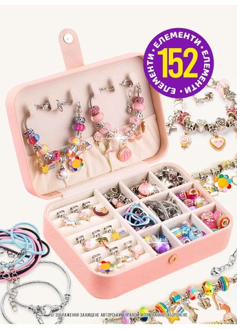 🎁 Набір для створення прикрас з шкатулкою – готовий подарунок, який дівчатка не забудуть 🌸 Цей набір для створення браслетів і прикрас стане справжнім захопленням для юної майстрині. Усе продумано до дрібниць: 152 елементи, стильна скринька для прикрас, подарунковий пакет — комплект повністю готовий до вручення! Яскравий дизайн, велика кількість деталей та естетична упаковка роблять цей набір для творчості ідеальним подарунком на День народження, 8 березня, Новий рік чи будь-яке інше свято. ✨ Переваги набору: -ідеальний подарунок – виглядає яскраво, стильно й “по-дорослому” -естетична привабливість – шкатулка виглядає як Pandora і викликає захват -унікальний дизайн – подібних рішень немає у конкурентів -готовий комплект – не потрібно шукати пакування чи листівку -розвиває дрібну моторику, фантазію, уяву, почуття стилю, посидючість -зручна скринька для прикрас – для зберігання або гри в дорозі -гіпоалергенні, безпечні матеріали – можна використовувати дітям від 4 років 👜 Шкатулка має розмір 11 х 15.8 х 5 см – зручно зберігати всі бусинки на браслет або використовувати як органайзер для вже готових прикрас. Матеріал водовідштовхувальний — набір зручно брати з собою в подорож, на свята чи до подружок. Подарунковий пакет має розмір 21 х 15 х 8 см — із ним набір одразу виглядає святково й ошатно. 📦 Комплектація: 50 шт скляних намистинок, 30 шт підвісок, 40 шт металевих шармів, 6 шнурочків на підвіски (2 рожеві, 2 сині, 2 чорні), 6 металевих браслетів – довжина від 16 см до 21 см, 19 силіконових стоперів, 1 палетка наклейок. 💖 Цей набір для виготовлення прикрас — не просто забавка, а справжній досвід радості та натхнення. Він дарує не лише прикраси, а й час, який дівчинка проводить у захопленій творчості. Це чудовий набір для браслетів з намистин, з яким можна створити унікальний подарунок для себе, мами чи подруги. Можна змінювати підвіски, додавати нові бусинки на браслет і вигадувати власний стиль. 🎉 Замовляйте зараз — і отримаєте набір для створення прикрас, який точно запам’ятається. Готовий подарунок, який дарує щирі емоції, розвиток фантазії та безліч прикрас, зроблених власноруч.