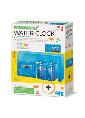 Що таке зелена енергія? Виявляється, для роботи приладу не обов'язково купувати батарейку, використовувати електрику з розетки або бензин. З набором для досліджень від 4М ви власноруч створите годинник, що працює від енергії води. У наборі ви знайдете все необхідне для створення годинника з докладними схемами та інструкцією. Додатково потрібні лише маленька хрестоподібна викрутка, столова сіль і двостороння клейка стрічка. Уявіть: батарейку можна зробити навіть із лимона або картоплі! Із цим комплектом із серії Green Science ви переконаєтеся, що солона вода теж є джерелом енергії. Годинники від 4М показують не лише час, але і дату. Встановіть актуальні дані, користуючись інструкцією. У наборі ви знайдете цікаві факти про енергію води та інші види зеленої енергії. Наприклад, ви знали, що в рятувальному обладнанні на деяких кораблях використовують батареї, які вмикаються при зіткненні з солоною морською водою? Набір від 4М знайомить з основами фізики, розвиває допитливість, мислення, дрібну моторику, уважність. Він буде цікавий дітям молодшого шкільного віку від 8 років. У наборі: Пластиковий корпус годинника – 1 шт. Посудина для води – 1 шт. Задній корпус модуля годинника – 1 шт. Годинник – 1 шт. Цинкова пластина – 2 шт. Мідна пластина – 2 шт. Провід – 1 шт. Тримач електрода – 1 шт. Набір гвинтів – 1 шт. Інструкція – 1 шт.