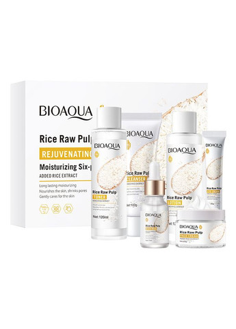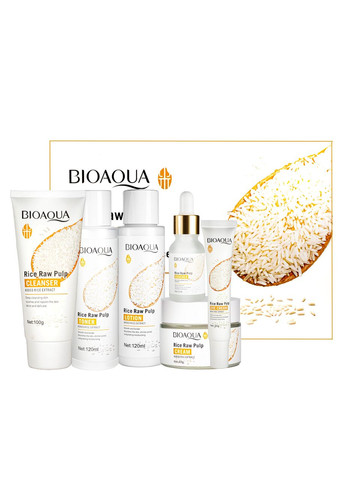 Набір для догляду за обличчям Bioaqua Rice Raw Pulp Set Відкрийте для себе повний догляд за шкірою з набором Bioaqua Rice Raw Pulp Set 6 в 1! Цей набір з екстрактом рису надасть вашій шкірі живлення, зволоження та омолодження, забезпечуючи комплексний підхід до боротьби з віковими змінами. Спробуйте цей набір і насолоджуйтесь свіжістю та красою вашої шкіри. Залишайтеся молодими та доглянутими з Bioaqua! Bioaqua Rice Raw Pulp Set 6 в 1 — це ідеальний вибір для жінок, які хочуть піклуватися про свою шкіру з використанням натуральних інгредієнтів. Набір включає всі необхідні засоби для повного догляду за обличчям: есенцію, крем, пінку для вмивання, лосьйон, тонер та маску, що збагачені екстрактом рису та гіалуроновою кислотою. Комплексний підхід допомагає зволожити, тонізувати та омолодити шкіру. Переваги: Омолоджуючий ефект: Екстракт рису допомагає зменшити видимість зморшок та підвищити еластичність шкіри. Глибоке зволоження: Гіалуронова кислота в складі забезпечує тривале зволоження та захист від сухості. Комплексний догляд: Набір включає всі етапи догляду — від очищення до живлення та тонізації. Легкість у використанні: Швидка та зручна рутинна процедура для будь-якого типу шкіри. Bioaqua Rice Raw Pulp Set 6 в 1 — це не просто косметика, а цілий комплекс для омолодження та підтримки здоров'я вашої шкіри. Забезпечте своїй шкірі зволоження, живлення та тонізацію з натуральними інгредієнтами!