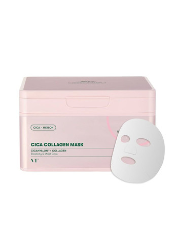 VT Cosmetics - CICA Collagen Mask - набір тканинних масок для обличчя. Вони призначені для зволоження, зміцнення та заспокоєння шкіри. У формулі використано колаген, який має розгладжуючий ефект і підвищує еластичність в'ялої шкіри. Зволожувальну дію гарантують гіалуронова кислота і трегалоза, які зміцнюють захисний бар'єр. Екстракт центелли азіатської та пантенол заспокоюють подразнення та стимулюють регенерацію. Маски виготовлені з тонкого, приємного матеріалу. Активні компоненти: колаген - має зволожувальну та розгладжувальну дію, підвищує пружність та еластичність шкіри, екстракт центелли азіатської - заспокоює подразнення, має протизапальну та регенерувальну дію, гіалуронова кислота - зволожує, підвищує еластичність, розгладжує, трегалоза - зміцнює гідроліпідний бар'єр, зволожує, заспокоює, пантенол - зволожує, заспокоює подразнення, посилює регенерацію. Дія засобу: - зміцнює, -зволожує, - заспокоює, - підвищує еластичність. Виробник рекомендує засіб для: - сухої шкіри, - шкіри, якій бракує пружності та еластичності, - усіх типів шкіри. Спосіб використання: Обережно дістати маску з упаковки і нанести на очищену шкіру обличчя. Залишити на 10-15 хвилин, потім зняти і розподілити залишки есенції по шкірі. Об'єм: 30 шт./320 g