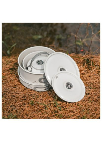 Готувати улюблені страви та гарячі напої на природі просто та комфортно, якщо у вашому арсеналі є функціональний набір великогабаритного посуду Naturehike CNH22CJ002. Комплект складається з чотирьох елементів: каструлі, казанка, сковороди та чайника, які виготовлені з надлегкого алюмінієвого сплаву з нержавіючими властивостями. Висока теплопровідність металу сприяє швидкому нагріванню їжі та закипанню води, а наявність антипригарного покриття на сковороді запобігає пригоранню продуктів під час смаження. Обʼєм та габарити посуду такі: Каструля: об'єм – 2 л, розмір – 173 х 97 мм; Казанок: об'єм – 2.9 л, розмір – 190 х 116 мм; Чайник: об'єм – 1.4 л, розмір – 153 х 84 мм; Сковорода: розмір – 199 х 50 мм, товщина стінок – 1.2 мм. Посуд укомплектований складаними ручками з пластиковими вставками. Вони уберігають від опіків під час зняття ємностей з вогню. У наборі також є одна кришка універсального розміру, сумісного з каструлею, казанком і сковородою, що дозволяє суттєво заощадити на кінцевій вазі посуду. Кришка має теплоізоляційну ручку, а наскрізні отвори по обидва боки призначені для зливання води. Посуд відрізняється простотою у догляді — просто промийте його під проточною водою, щоб видалити залишки їжі та жиру, і протріть чистим, сухим рушником. Кожен елемент компактно складається один в одного, підвищуючи зручність транспортування. Для цього також передбачено мішок для зберігання.