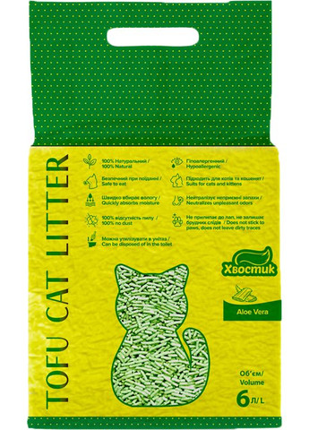 Соєвий наповнювач Тофу Хвостик з ароматом алое віра, 6 літрів (2.6 кг). Основні переваги: Наповнювач Тофу – спресовані гранули із соєвих волокон, які вбирають велику кількість вологи; 100% натуральний; Повна відсутність пилу за рахунок вакуумного пакування; Чи не розноситься за лапками, не залишає брудних слідів; Нешкідливий при попаданні в шлунок (може використовуватися для найменших вихованців); Гіпоалергенний (для тварин та людей); Волоконна структура забезпечує якісне з'єднання гранул, утворюючи грудку та блокуючи запах усередині, а ароматичні добавки забезпечують приємний м'який аромат; Після формування грудок не розсипається, має форму пірамідки; Використані гранули можна змивати в унітаз. Запобіжні заходи: Не змивати більше 1 грудки за раз. Якщо потрібно змити два або більше грудок, змивайте їх окремо і в проміжках між грудками робіть один холостий злив води. Спосіб застосування: Засипте гранули наповнювача Хвостик у лоток шаром 3-4 см; Щодня видаляйте грудочки, що утворилися. Чим частіше ви це робите, краще наповнювач утримує запах; Досипайте невелику кількість наповнювача, щоб підтримати необхідний рівень Об'єм: 6 літрів. Вага: 2.6 кг. Аромат – алое віра.