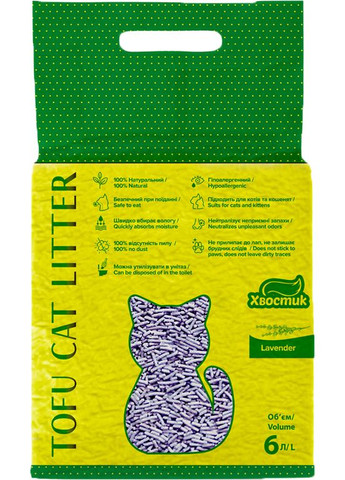 При використанні наповнювач утворює грудку у формі пірамідки, яка не розсипається і тримає форму. Також він блокує всередині неприємний запах, а ніжний ненав'язливий аромат лаванди додатково дезодорує житло. Наповнювач - гіпоалергенний і підходить для використання навіть найменшими пухнастими вихованцями. Він не є токсичним і для людей. Якщо домашній улюбленець випадково проковтне соєві гранули – з ним також не станеться нічого небезпечного. Після використання грудки можна змивати в унітаз. Головне робити це по одному за раз. Наповнювач Тофу не розноситься лапками по будинку у вигляді пилу і, з метою максимальної безпеки, упакований вакуумним способом. Переваги: Виготовлений із натуральних компонентів - спресовані гранули із соєвих волокон; Вбирає велику кількість вологи; Безпечний навіть при ковтанні; Може використовуватися для кошенят; Гіпоалергенний для тварин та людини; Приємний аромат лаванди; Здатність утримувати неприємний запах усередині грудки; При використанні наповнювач формується в грудку, що має форму пірамідки. Він не розсипається;Використана грудка наповнювача легко утилізується - досить просто змити його в унітаз;Наповнювач упакований у вакуумне пакування; Запобіжні заходи: Змивати в унітаз потрібно не більше однієї грудки за раз. Якщо необхідно змити 2 і більше грудки, змийте їх окремо і в проміжках між ними робіть 1 холостий злив води. Спосіб застосування: Засипте гранули наповнювача Хвостик у лоток шаром 3-4 см; Щодня видаляйте грудочки, що утворилися. Чим частіше ви це робите, краще наповнювач утримує запах; Досипайте невелику кількість наповнювача, щоб підтримати потрібний рівень. Об'єм: 6 літрів Вага: 2,6 кг Аромат: лаванда.