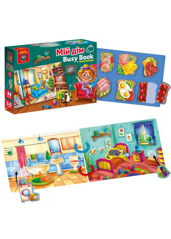 Основні характеристики: Тип гри: Розвиваюча гра з липучками Вік: від 3 років Склад: книжка з липучками Мета гри: Розвиток навичок самообслуговування та знайомство з домом Опис товару: Ігрова книжка "Мій дім" допомагає дитині вивчати елементи побуту, різні кімнати в домі та предмети інтер'єру. За допомогою липучок можна створювати різні сцени та ситуації, що допомагає розвивати логіку та увагу дитини. Гра підходить для дітей, які тільки починають освоювати домашній побут.
