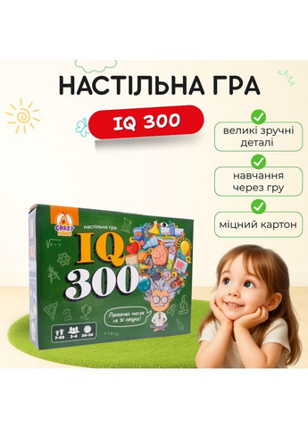 Прокачай мозок за 30 секунд! Настільна гра IQ300 тобі допоможе. Крутіть стрілку, тягніть картку. У вас є 30 секунд, щоб назвати якомога більше слів і просунути свого пішака. Першим пройдіть три кола, щоб набрати 300 IQ та перемогти! Вік: 7-99 років. Кількість гравців: 2-4. Тривалість гри: 20-30 хвилин.