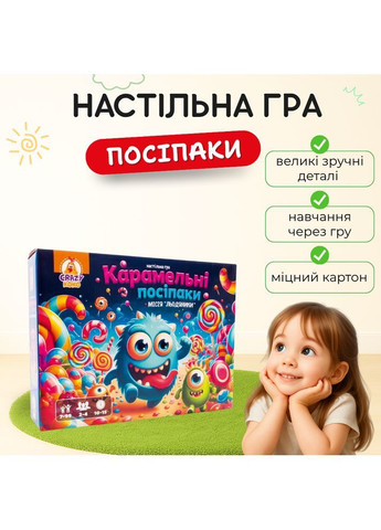 Настільна маршрутна гра "Карамельні посіпаки" під кодовою назвою "Місія льодяники". Обирай монстрика. Кидай кубик та рухайся полем. Виконуй вказані дії: долай перешкоди, уникай аварій, користуйся шансом і відпочинком. Принеси до скрині найбільше льодяників! Вік: 7+ років. Кількість гравців: 2-4. Тривалість гри: 10-15 хвилин.