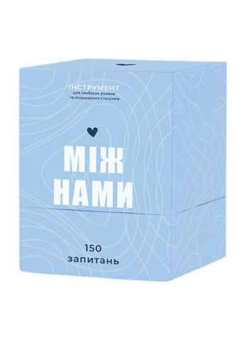 Між нами – 150 питань, щоб дізнатися про людину Між нами – це не просто гра, а 150 глибоких та розумних питань, які допоможуть дізнатися про будь-яку людину. Під час гри вам доведеться поділитися своїми думками, бажаннями, устремліннями, життєвими історіями або промоделювати можливі ситуації. Питання у грі поділені на 6 категорій, щоб учасникам було легше орієнтуватися: