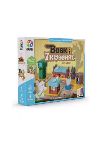 Гра Гра Вовк і семеро козенят допоможе дітям розвивати логіку, навички дедукції та орієнтування, адже мета гри — допомогти семи козенятам сховатися під меблями, перш ніж їх знайде вовк. Але не кожен козенятко поміститься під кожен предмет меблів, тому потрібно думати і діяти обережно. Ігровий процес включає 48 завдань, від простих до складних, що робить гру цікавою і навчальною для дітей від 3 до 7 років. Гра має книжку з казками, що додається, і дозволяє дітям вивчати форми, орієнтацію та розв’язувати задачі через гру. Це чудова можливість для розвитку уваги та логічного мислення. Розвиток Гра сприяє розвитку уваги, логіки, просторової уяви та навичок дедукції. Вона допомагає дитині вчитися мислити стратегічно, планувати та вирішувати завдання, одночасно розвиваючи моторику та уяву. Особливості Бренд: Smart Games; Країна бренду: Бельгія; Країна виробництва: Бельгія; Рекомендований вік: 3–7 років; Час гри: 15 хвилин; Розмір пакунку: 6 x 29 x 24 см; Вага: 1 кг 200 г; Матеріал: пластик; Тип гри: логічна, головоломка; Кількість гравців: 1; Мова: українська; Особливості: 48 завдань, казковий сюжет, книжка з картинками в комплекті; Комплектація: 7 козенят різних форм, 5 деталей меблів, 1 вовк, 1 ігрове поле, буклет із завданнями, правила гри, бонусна книжка з картинками.
