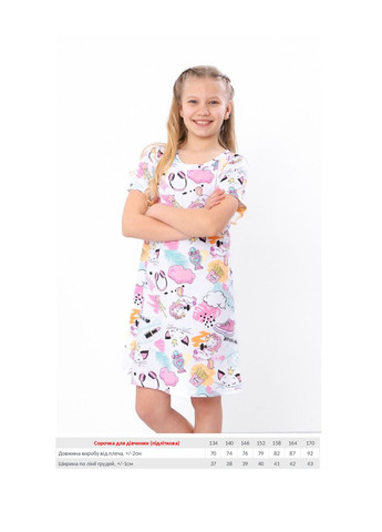 Стильна нічна сорочка для дівчаток з легкого куліру. Модель з короткими рукавами, округлим вирізом. По переду сорочки - милий принт, виконаний методом шовкотрафаретного друку. Модель представлена в декількох кольорах на будь-який смак, може використовуватися в якості домашнього плаття. Полотно хорошої якості, натуральне за складом, може давати усадку після прання. Полотно: кулір Склад: 100% бавовна Рекомендації з догляду: прати при температурі не більше 30°C, принт прасувати тільки з виворотної сторони.