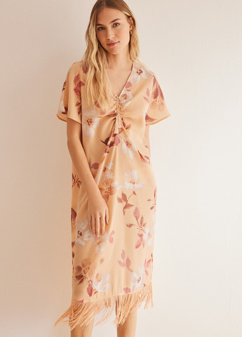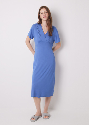 Сорочка довжини міді з приємної на дотик віскози красивого синього кольору. Надзвичайно м’яка і зручна, ви не захочете її знімати цілий день. Ідеально для цього сезону! Перехрещений V-подібний виріз зі складками по бокам. Розріз по талії зі зборками на спині.