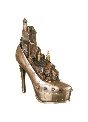 "Стімпанк "Черевик-Місто"" виконана в стилі симпатик від відомого бренду Veronese, стане оригінальним акцентом в інтер'єрі і дасть неповторну атмосферу. Статуетка з детальним опрацюванням деталей нікого не залишить байдужим та стане чудовим подарунком любителям незвичайних, оригінальних речей. Сподобається тим, хто захоплюється сучасним мистецтвом. Статуетка виготовлена з полістоуну (штучного каменю) та покрита бронзовим напиленням. Запакована в пінопласт та гарну подарункову упаковку."