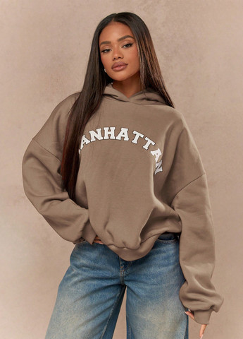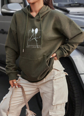 Спущена лінія плеча створює трендовий силует, а рукави на манжетах забезпечують зручну посадку. Головною родзинкою моделі є стильна аплікація з якісних стразів на передній частині, яка надає худі елегантного та сучасного вигляду.