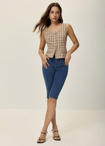 Капрі із завищеною талією у вінтажному стилі преппі. Має деталі на гудзиках та блискавках, накладні кишені та стандартну посадку. Застібка-блискавка. Природна талія. Легка еластична джинсова тканина.