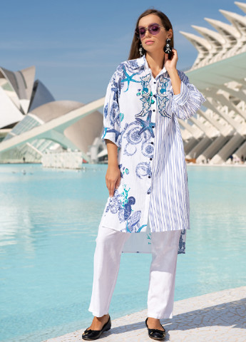 Широка туніка з комбінованої тканиною, рукава з манжетом. Горловина оформлена V-образним коміром з невеликим вирізом. Застібка - планка по центру на ґудзиках. Рукав довгий з манжетом. М'яка бавовняна тканина і універсальність зроблять цю річ коханої у вашому гардеробі. Адже її можна носити як коротке плаття, одягнути зі спідницею і будь-яким брючним низом.
