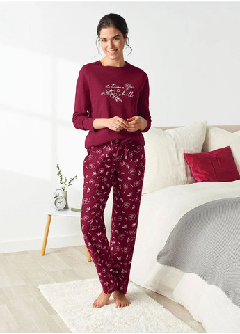 Виміри: Розмір 134-140: Лонгслів: довжина-51 см, рукав-49 см, ПОГ-37 см. Штани: довжина-84 см, кроковий шов-60 см, ПОТ-28 см/37 см (максимальне розтягування). Розмір 146-152: Лонгслів: довжина-54 см, рукав-54 см, ПОГ-38 см. Штани: довжина-90 см, кроковий шов-66 см, ПОТ-31 см/41 см (максимальне розтягування). Розмір 158-164: Лонгслів: довжина-59 см, рукав-59 см, ПОГ-44 см. Штани: довжина-98 см, кроковий шов-73 см, ПОТ-34 см/44 см (максимальне розтягування). Домашній костюм-піжама виконаний із бавовняного полотна. Лонгслів трикотажний, горловина оброблена бейкою, що запобігає розтягуванню та деформації; прикрашений принтом. Штани фланелеві, по лінії талії на гумці з шнурком, що регулюється, внизу на трикотажних манжетах. Виріб стійкий до багаторазового прання.