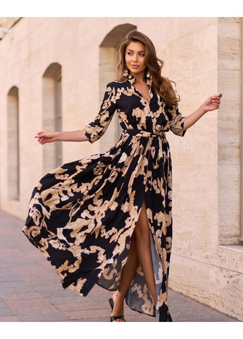 Коричнева легка сукня з принтованого штапелю з максі довжиною і розрізом спереду. Модель з V-подібною горловиною, рукавами 3\4, коміром та бічними кишенями. Сукня з гумкою на талії має знімний пояс. Напівобхват: Груди: S (46), M (48), L (50), XL (52), XXL (54), 3XL (56); Талія: S (30-40), M (32-42), L (34-44), XL (36-46), XXL (38-48), 3XL (40-50); Стегна: S (84), M (86), L (88), XL (90), XXL (92), 3XL (94); Довжина виробу - 145-147*; Рукав - 36-40*; Тканина: Низької еластичності. Парметри моделі: Зріст: 165 см Груди: 81 см Талія: 64 см Стегна: 90 см На моделі розмір: S