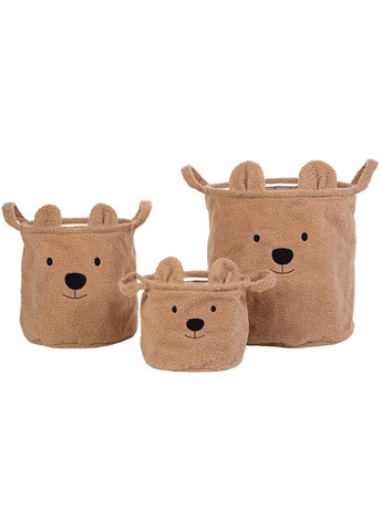 Набір кошиків для іграшок Childhome (Чайлдхоум) Teddy виготовлений з м'якої плюшевої тканини. Цей набір із 3 кошиків чудово підходить для зберігання різних речей, таких як іграшки, одяг та інші речі вашого малюка. М'яка тканина Тедді та милі ведмежі вушка одразу створюють затишок в оселі. Кошик має зручну внутрішню підкладку, яку легко чистити вологою ганчіркою. Основні переваги: ідеально підходить для зберігання іграшок або предметів догляду ідеально підходить як стильна деталь в дитячій кімнаті зручний розмір, який можна поставити в шафу або на полицю Характеристики Розміри: кошик маленький: 25x20x20 см кошик середній: 30x30x30 см кошик великий: 40x40x40 см Матеріал: 100% поліестер Догляд: не можна прати в пральній машині - очистіть вологою тканиною та висушіть Увага: ці кошики не є іграшкою. Використовуйте лише як прикрасу або як кошик для зберігання. Виробник: Childhome, Китай.