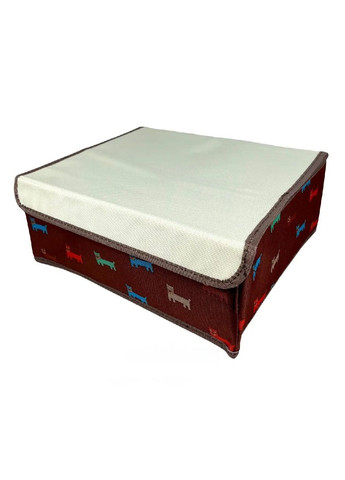 Органайзер являє собою складаний ящик із кришкою. Для збереження форми передбачено щільне знімне дно. Усередині одне основне відділення без осередків. Виконаний органайзер із текстилю з імітацією мішковини, такий дизайн додасть затишку у будь-якому житловому приміщенні. Ви можете використовувати такий бокс під час подорожей, оскільки у складеному вигляді він не займає багато місця. Розміри виробу дозволяють розмістити його у шафі, під ліжком чи просто на підлозі. На даному комплекті органайзер кришка фіксується за допомогою магніту.