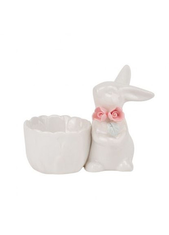Діаметр - 6,5 см, довжина - 10 см, висота - 7 см. Великодня керамічна підставка для яйця з білим кроликом – це витончений святковий аксесуар для сервірування великоднього столу. Фігурка кролика, прикрашена ніжними рожевими трояндами, додає виробу чарівності та весняного настрою. Підставка виконана у формі квітки, що гармонійно поєднується з білою глянцевою керамікою. Ідеальний вибір для святкової подачі крашанок або декоративного оформлення столу.