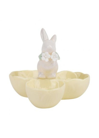 Висота - 9 см, довжина з кроликом - 18 см, діаметр підставки - 15 см. Великодня керамічна підставка з білим кроликом – витончений і стильний елемент святкового декору. Виготовлена у формі невисокої платформи з хвилястими краями, вона ідеально підходить для подачі пасхальних ласощів, випічки або яєць. Білий кролик, що підтримує підставку, додає виробу ніжності та святкової атмосфери, а делікатна квіткова прикраса завершує вишуканий дизайн. Така підставка стане чудовим доповненням до великоднього столу або елегантним подарунком для поціновувачів гарного декору.