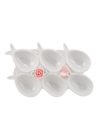 Довжина - 19 см, ширина - 11 см, висота - 2,5 см. Ця витончена керамічна підставка для 6 яєць – ідеальне рішення для великоднього столу та сервірування святкового сніданку. Виготовлена у світлих пастельних тонах, вона має ніжні декоративні елементи – квітку та метелика, що додають особливого шарму. Ергономічна форма з плавними контурами забезпечує зручне розміщення яєць, а стильний дизайн робить її чудовим доповненням до весняного декору. Така підставка стане не лише практичним аксесуаром, а й гарним подарунком для любителів естетичних деталей у сервіруванні.