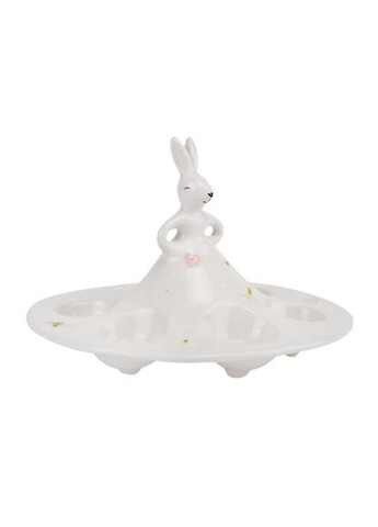 Висота - 9 см, довжина з кроликом - 18 см, діаметр підставки - 15 см. Великодня керамічна підставка з білим кроликом – витончений і стильний елемент святкового декору. Виготовлена у формі невисокої платформи з хвилястими краями, вона ідеально підходить для подачі пасхальних ласощів, випічки або яєць. Білий кролик, що підтримує підставку, додає виробу ніжності та святкової атмосфери, а делікатна квіткова прикраса завершує вишуканий дизайн. Така підставка стане чудовим доповненням до великоднього столу або елегантним подарунком для поціновувачів гарного декору.
