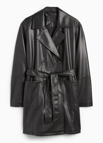 Двобортне пальто з м'якої дрібнозернистої штучної шкіри. Пасок, що зав'язується на талії, дві накладні кишені і гладка ткана підкладка.