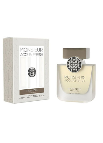 Milestone Monsieur Aqua Fresh Monsieur Aqua Fresh від Milestone — це справжній ковток свіжості для сучасного чоловіка. Енергійний, легкий і глибокий аромат, що поєднує в собі морську чистоту, цитрусову яскравість і благородну теплоту деревини. Ідеальне рішення для щоденного використання в теплу пору року, а також чудовий варіант для активних чоловіків, які цінують чистоту, стиль і елегантність. У верхніх нотах звучать вибухові цитрусові акорди — лайм, лимон, бергамот, мандарин і апельсин, доповнені витонченою свіжістю неролі та жасмину. Цей старт пробуджує й надає енергію, залишаючи після себе відчуття легкості та чистоти. Серце аромату розкриває багатий квітково-пряний букет. Морська хвиля акватичних нот у поєднанні з калоном, жасмином, фіалкою, персиком, фрезією, гіацинтом, цикламоном, розмарином, трояндою, коріандром і мускатним горіхом створює складну багатовимірну композицію. Вона одночасно свіжа, пряна та квіткова, але не надто солодка — ідеально збалансована. База аромату дарує шлейф із нот білого мускусу, кедра, дубового моху, пачулів та амбри. Саме ця частина робить аромат стійким, глибоким і досконалим. Він розкривається поступово, залишаючи незабутній елегантний слід