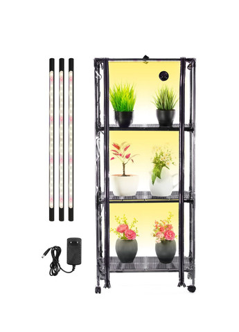 Міні-теплиця з фіто світлом для дому Sezam Black Strong + 3 вентилятори Sezam XL Black Strong – це триповерхова конструкція з міцних металевих трубок з полицями для розміщення рослин, призначена для догляду за ними в домашніх умовах. До комплекту додатково входить: Вентилятор на кожен поверх (всього 3 шт.) для циркуляції повітря всередині теплиці. Переваги міні-теплиці Sezam XL Black Strong: Оптимальний мікроклімат: Прозорий чохол створює сприятливі умови для росту рослин, а також захищає їх від перепадів температур, шкідників і протягів. Ефективне освітлення: LED лампи «фіто спектру» з високою світловою віддачею забезпечують необхідне освітлення для кімнатних рослин, навіть у темних приміщеннях. Міцність і стійкість: Каркас міні-теплиці витримує навантаження до 30 кг. Простота збирання: Зібрати теплицю можна за кілька хвилин без спеціальних інструментів. Естетичний дизайн: Елементи каркаса покриті полімерною порошковою фарбою, що надає теплиці стильний вигляд та стійкість до корозії. Зручне спостереження: Зовнішній чохол з силіконової плівки товщиною 200 мкм дає можливість повноцінно спостерігати за розвитком і станом рослин. Безпека для людей і тварин: Біле світло ламп Metaplant не дратує людське око і не шкодить зору. Лампи мають понижену безпечну напругу живлення 12 В. Якісні комплектуючі: Світлодіоди Samsung LM301B – це кращі на сьогоднішній день світлодіоди для фітосвіту. ТЕХНІЧНІ ХАРАКТЕРИСТИКИ: Спектр світильника: Full Spectrum Кількість світлодіодів (Samsung LM301B): 3 * 20 Розмір світильника: 600 * 19 мм (діаметр) Щільність світлового потоку (PAR): 3 * 106, μMol / m 2 / s Освітленість (Illuminance): 3 * 7188 Lx Світловий потік (Φ v ): 3 * 1517 Lm Світлова віддача (Luminous performance): 220 Lm / W Енергетична освітленість (IRR): 22,57 W / m 2 Індекс передачі кольору CRI (Ra): 85,66% Колірна температура (CCT): 3417 К Розмір міні-теплиці в зібраному вигляді: 1445 * 640 * 340 мм З міні-теплицею Sezam XL Black Strong ви можете вирощувати свіжу зелень, ароматні трави, екзотичні фрукти та красиві квіти в будь-яку пору року!