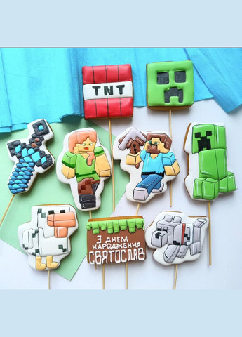 Пряники ручної роботи з дизайном за мотивами популярної гри Minecraft. Чудовий варіант для дитячого свята, дня народження Виготовляються з ароматного медового тіста з ванільною ноткою, покриті кольоровою глазур'ю з яскравим, стійким малюнком. Характеристики: — Розміри: від 6 до 10 см залежно від форми — Можливе паковання поштучно або в набір — Термін зберігання: до 6 місяців – Можна використовувати як декор для торта або частування для гостей