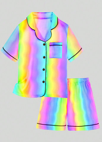 Піжамний комплект для дівчаток-підлітків – барвистий смугастий дизайн. Цей піжамний комплект відрізняється яскравим смугастим вертикальним принтом. Він включає сорочка з короткими рукавами, а також відповідні шорти. Сорочка має застібку на гудзики спереду та контрастні деталі з окантовкою. Комплект виготовлений із нееластичної тканини. Він включає кишені.