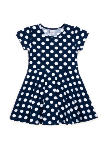 Виконано з м'якого, тонкого турецького бавовняного трикотажу, з додаванням невеликого % еластану для підтримання форми виробу. Тканина дуже приємна навпомацки. Сукня білого кольору в темно-синю, середньої ширини, смужку. По всьому полю сукні розкидані кумедні фігурки, літери, смайлики.